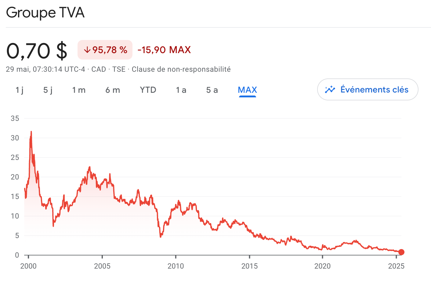 Sous le règne de Pierre Karl Péladeau, la valeur de l’action du Groupe TVA est passée d’environ 10 $ au moment du rachat à 0,70 $ aujourd’hui.